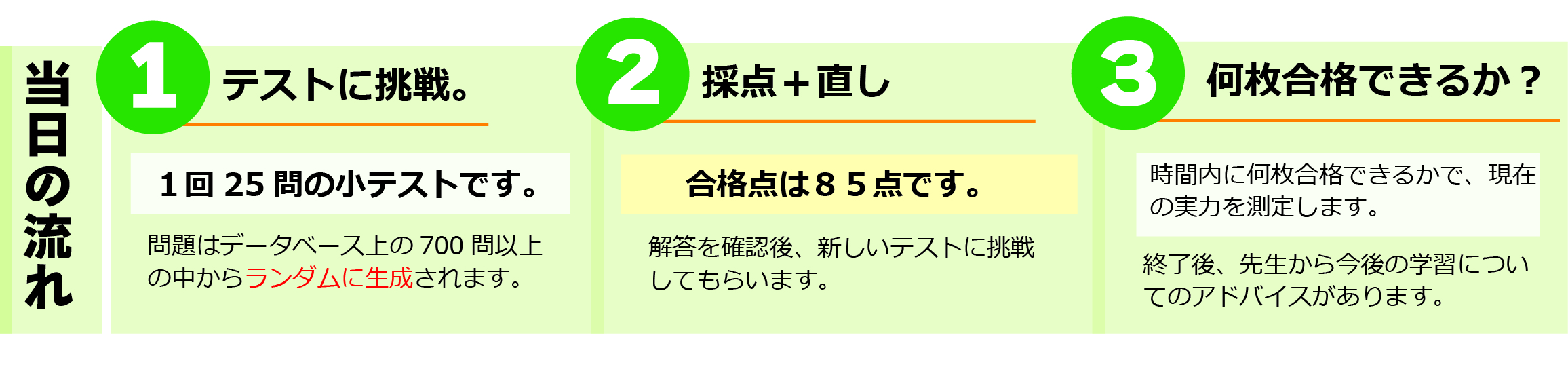 この特訓では、一問一答形式のテストを実施して知識として定着しているかどうかを確かめます。合格点がとれるまで