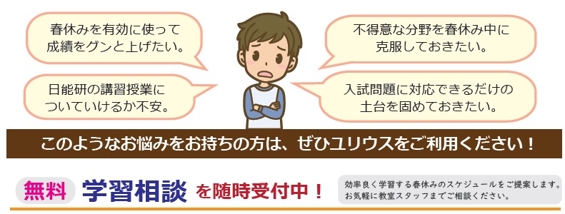 長時間、ひとりで勉強を続ける自信のない人や日能研の春期講習の授業がない日を有効に使いたい人は、ぜひご利用ください。講座内容についてのお問い合わせは、ユリウス各教室まで。