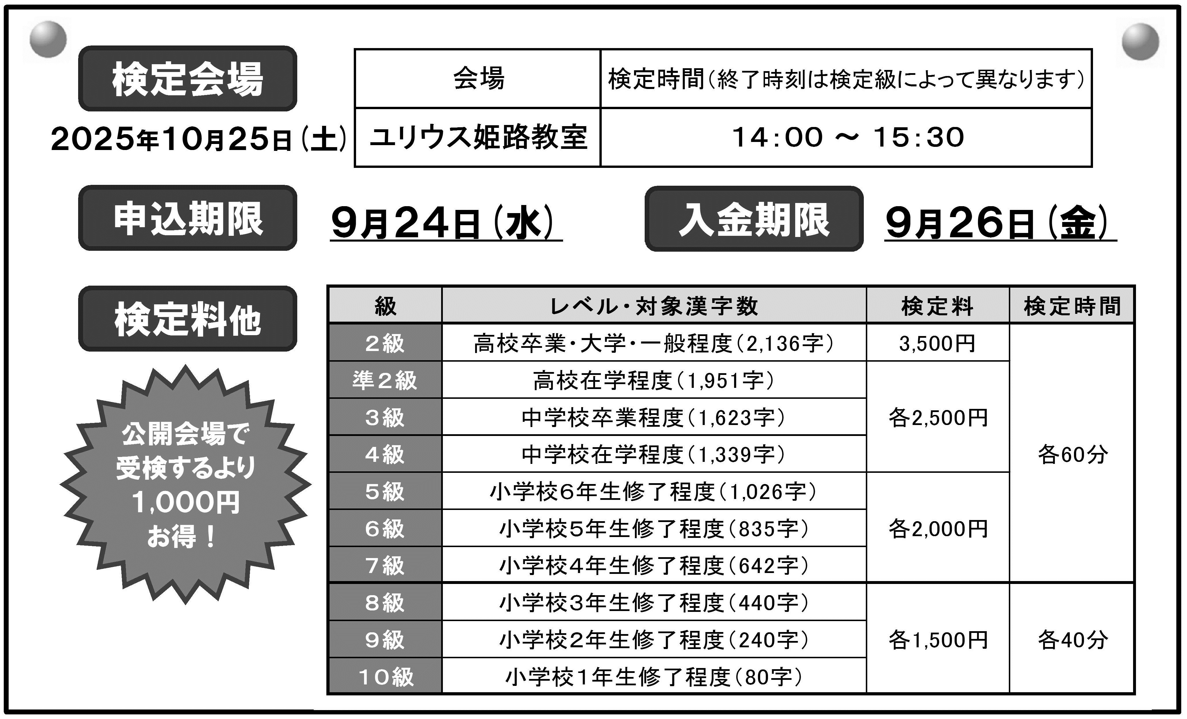 10月25日(土)、ユリウス姫路教室で漢検を受検することができます。